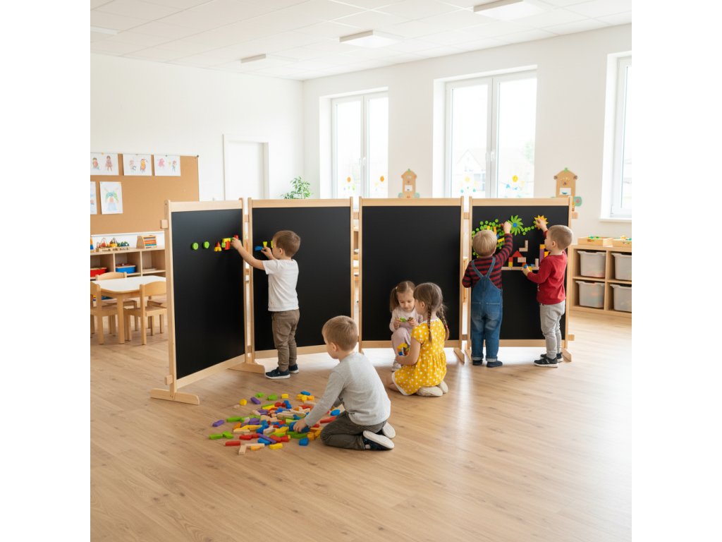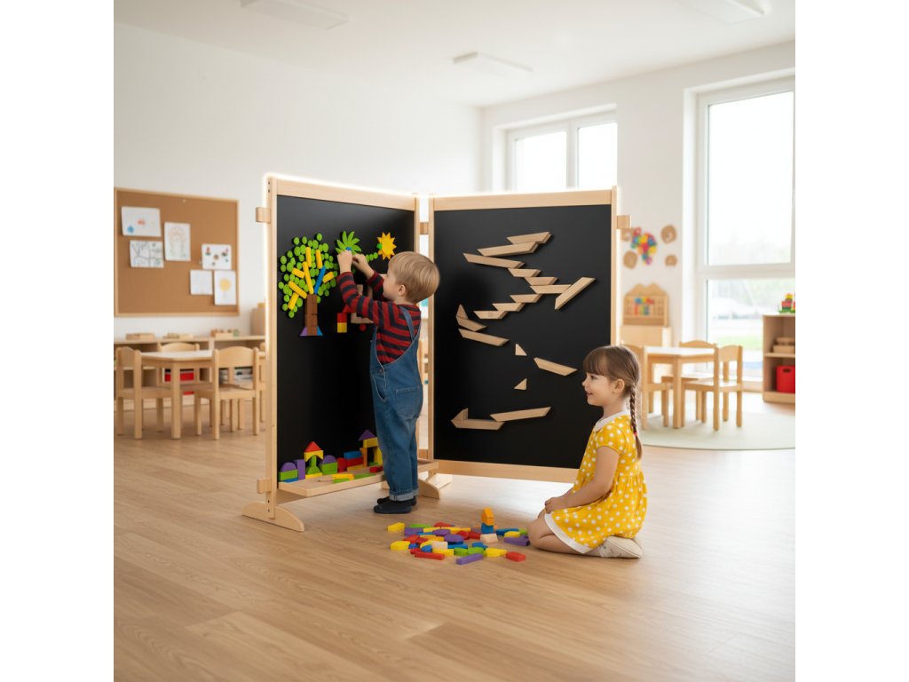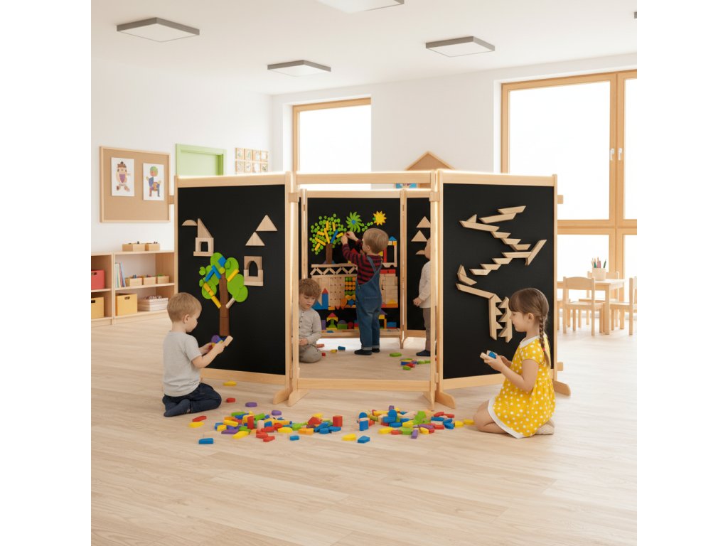 Tenhle paraván není jen obyčejná přepážka. Je to malé kreativní hřiště, které promění každý dětský kout v laboratoř nápadů, stavění a objevování.