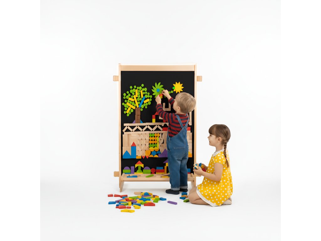 Vyrobený z poctivého masivního dřeva, stabilní jako skála a přitom přívětivý na pohled i dotek. Každý panel nabízí plochu pro skládání, stavění, třídění a hraní – ideální pro školky, herny i domácí kreativní zónu.