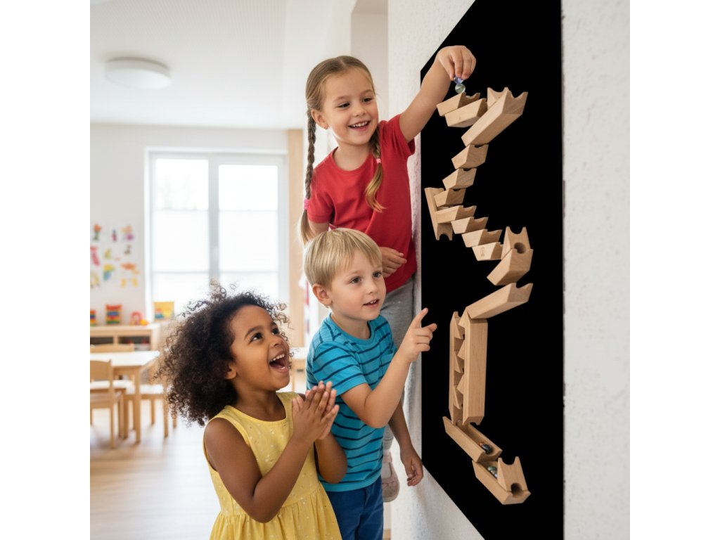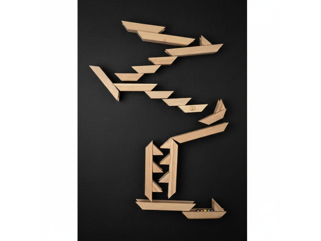 Všechny dřevěné dílky jsou na zadní straně opatřeny samolepicím suchým zipem. Díky němu je lze opakovaně připevňovat na černou Hrací desku T-WOOD (ta není součástí tohoto základního setu). Pokud tuto Hrací desku T-WOOD nevlastníte, lze zakoupit zde Kuličková dráha 26 set. Ta již potřebnou plochu pro připevnění dílků obsahuje. Dřevěné dílky doplňují různobarevné skleněné kuličky z odolného a kvalitního mexického skla.